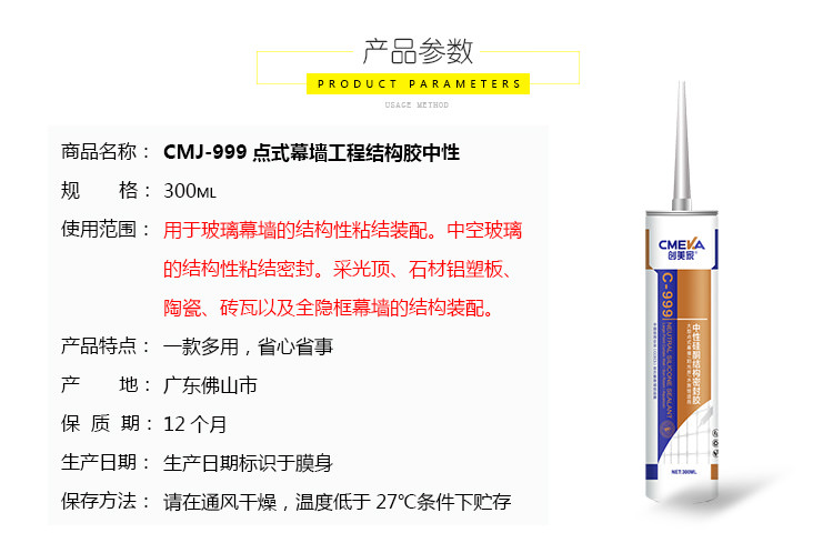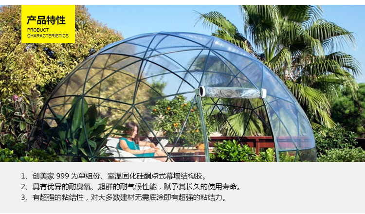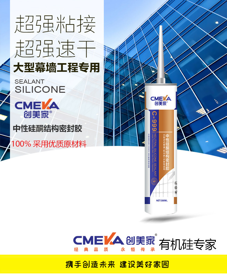 1、創美家C-999為單組份、室溫固化硅 酮點式幕墻結構膠。