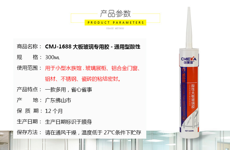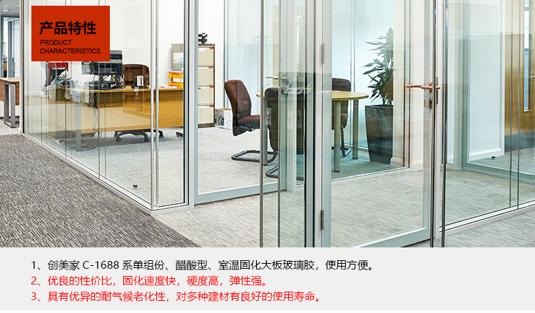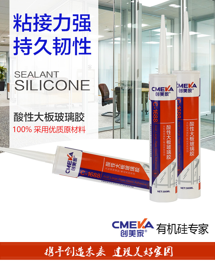 1、創(chuàng)美家C-1688系單組份、醋酸型、室溫固化硅酮玻璃膠,使用方便。
