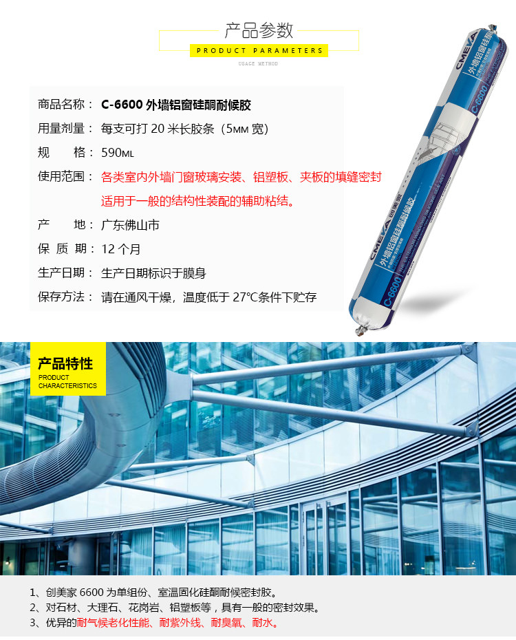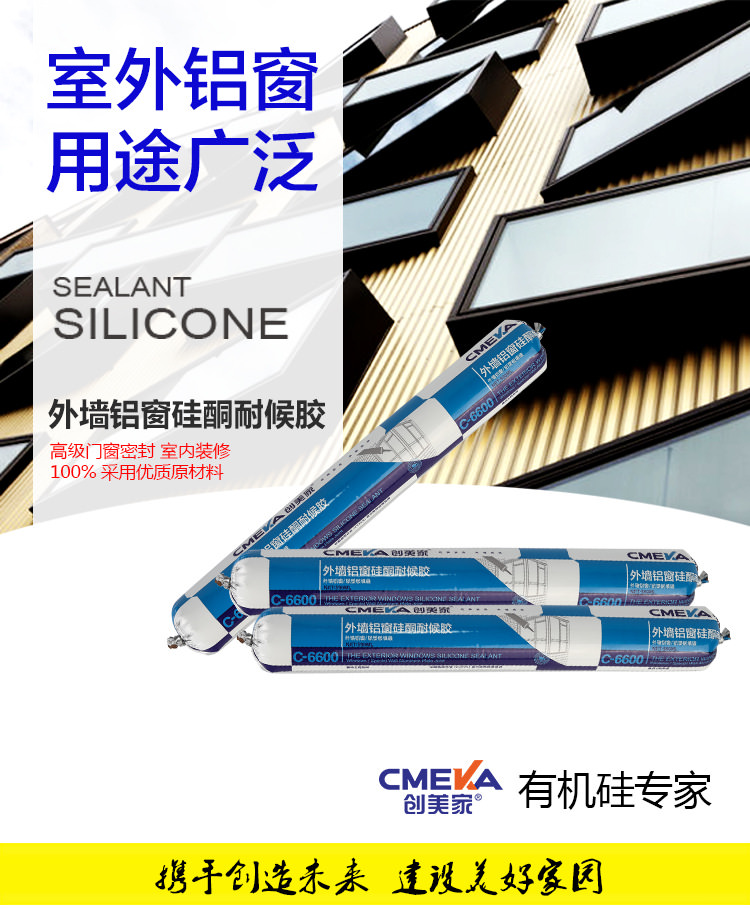 1、創美家C-6600為單組份、室溫固化硅酮結構密封膠。